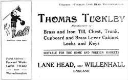 The Scout movement had been established in the early 1900's and by 1910 had overseas groups in Australia, Belgium, Gibraltar, Ireland, Malta, New Zealand, South Africa. Most commonwealth countries were excellent markets for locks and in 1909 a 3 year export agreement was signed by Henry Campbell of London and Thomas Tuckley Lock Makers. It made Henry Campbell their sole export agent in London and Australia. It must have been a successful arrangement because it was renewed in 1912 for a further 3 years. A Dave Gudgin, perhaps the former workhouse apprentice with George Tuckley, was working at the lock works, Thomas Tuckley, in the 1930's.
