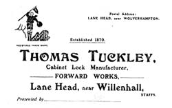 A locksmith worked in his own small smithy which usually formed part of his dwelling house and he had no assistance beyond his family. There are many web sites giving details of the Lock Industry and a few are listed under Links. Tuckley families were involved in lock making in the Willenhall area of Staffordshire for approximately 250 years from 1726 to 1971. Humphrey [ circa 1718 to 1793] and his brother John Tuckley [circa 1718 to 1766] were both described as Locksmiths but how and where they learnt their trade is not known. John in his will of 1766 was described as a Spring Chest Locksmith. Humphrey Tackley [Tuckley] was listed as a Box Lockmaker in the Willenhall section of the 1780 Pearson and Rollason Directory for Merchants and Tradesmen.This is the first published reference in a Directory to a Tuckley lockmaker. Humphrey had 4 sons all involved in the lock industry in the Lane Head area John 1740 - 1808, Thomas 1750 - 1822, William 1754 - 1793 and Joseph 1758 - circa 1800. Humphrey in his will of 1793 left land, dwellings at Lane Head and his tools to his surviving sons John, Thomas and Joseph and legacies to his daughters. John [1740 to 1808] was described in 1765 as a locksmith in the Bushbury church marriage records. Professions were not usually given in the marriage records of this period so it may indicate he had status in the community William [1754 to 1793] moved from Lane Head to Kidderminster in 1765, Darlaston in 1766 and then to Wednesbury between1767 and 1769. William's sons who started the Tipton branch of the family, became coal miners and canal boat builders. In the early 1800's there were 6 major Tuckley family groups involved in lock making in the Lane Head, Short Heath areas of Willenhall. They had large families and most of the people with name who are still living in the Black Country area are their descendents :- Sons of John and Mary Tagg :